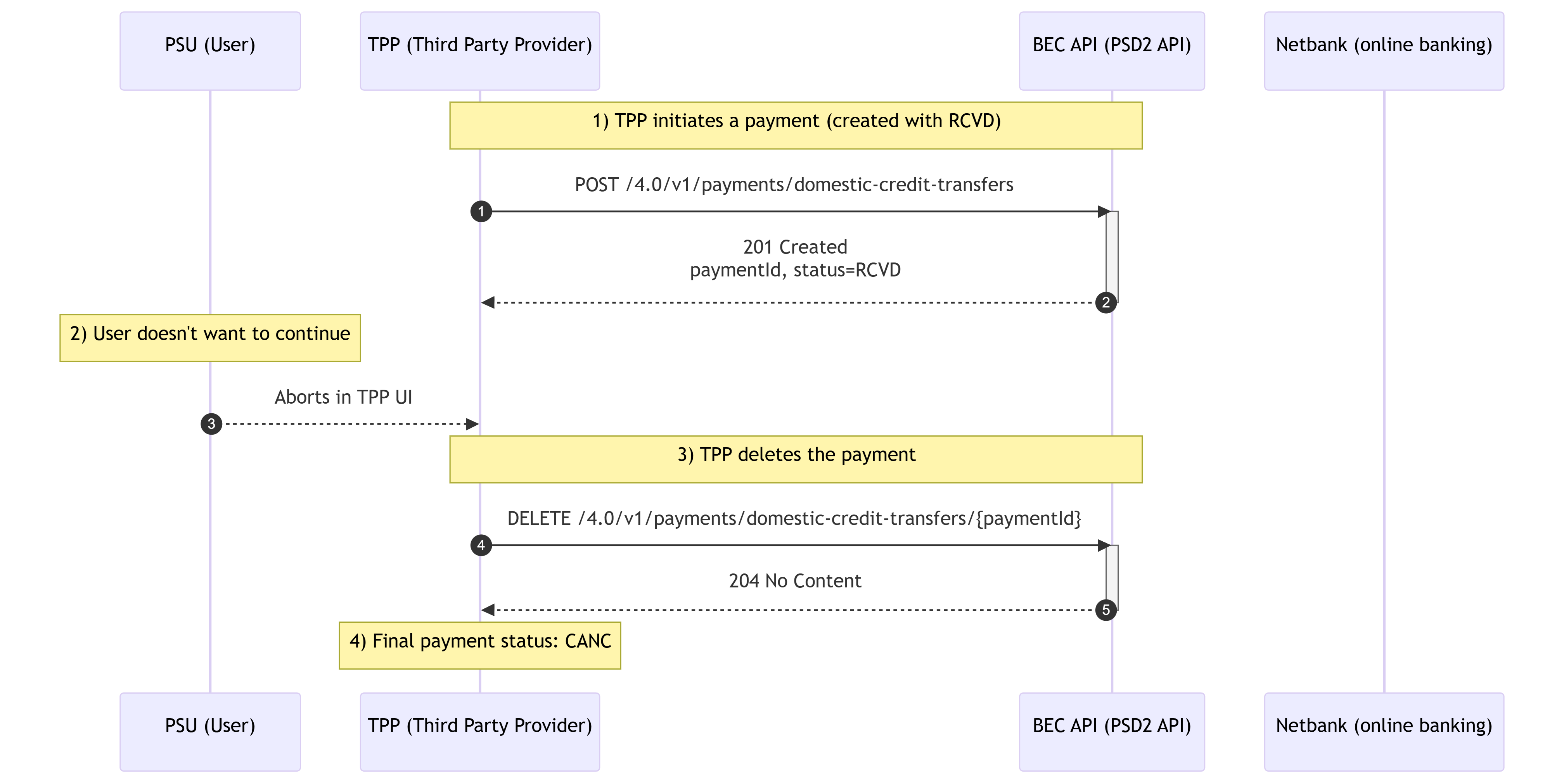 The diagrams below show two cases of payment cancellation: payment that hasn't been approved yet and payment that has been approved.
