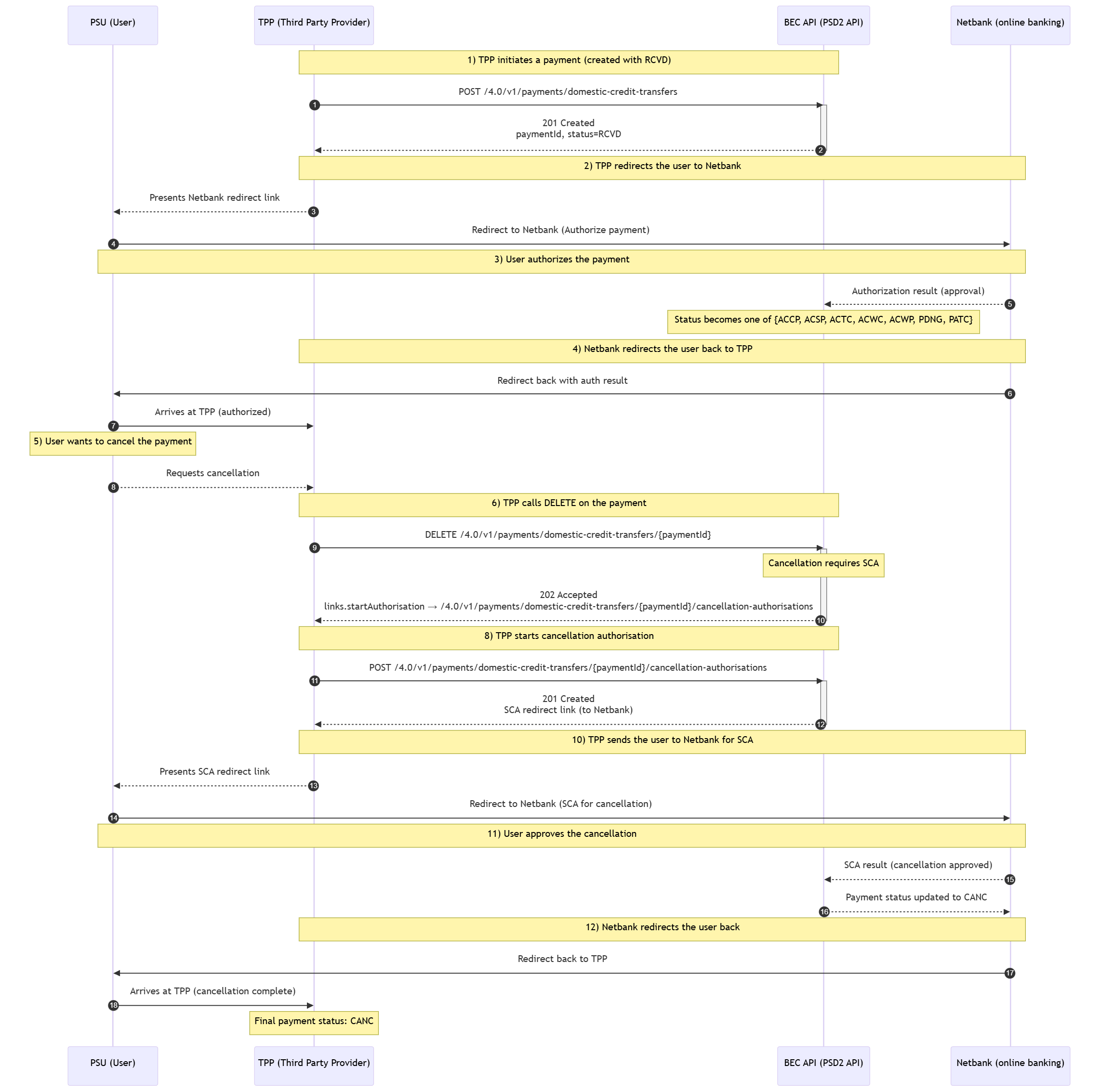 The diagram below depicts an overview of the flow, taking place during the creation and authorisation of a payment, including who plays what role. The respective banks responsibility is limited to the actions happening between the TPP and ASPSP. All parts of the flow are described except the SCA, which has been depicted below.